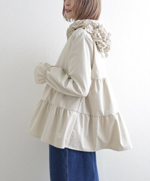 大人可愛い雰囲気を演出するフリルフード付きティアードジャケット。