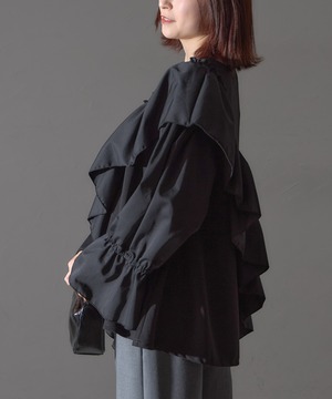 大胆な斜めフリルをあしらいながらも、シンプルなブラックでまとめて大人っぽい印象に仕上げました。