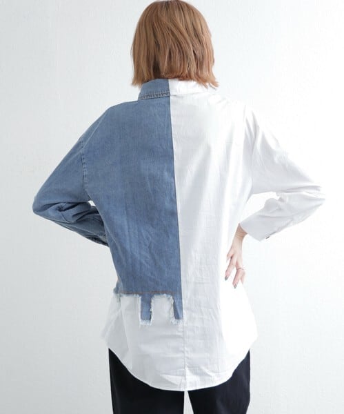 異素材の組み合わせが目を惹く、デニム切替デザインブラウス。