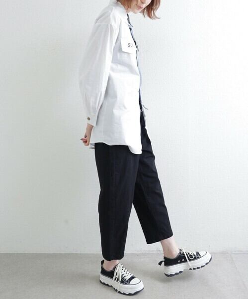 身幅にゆとりを持たせたシルエットで、体のラインを拾いにくくリラックスした着心地。