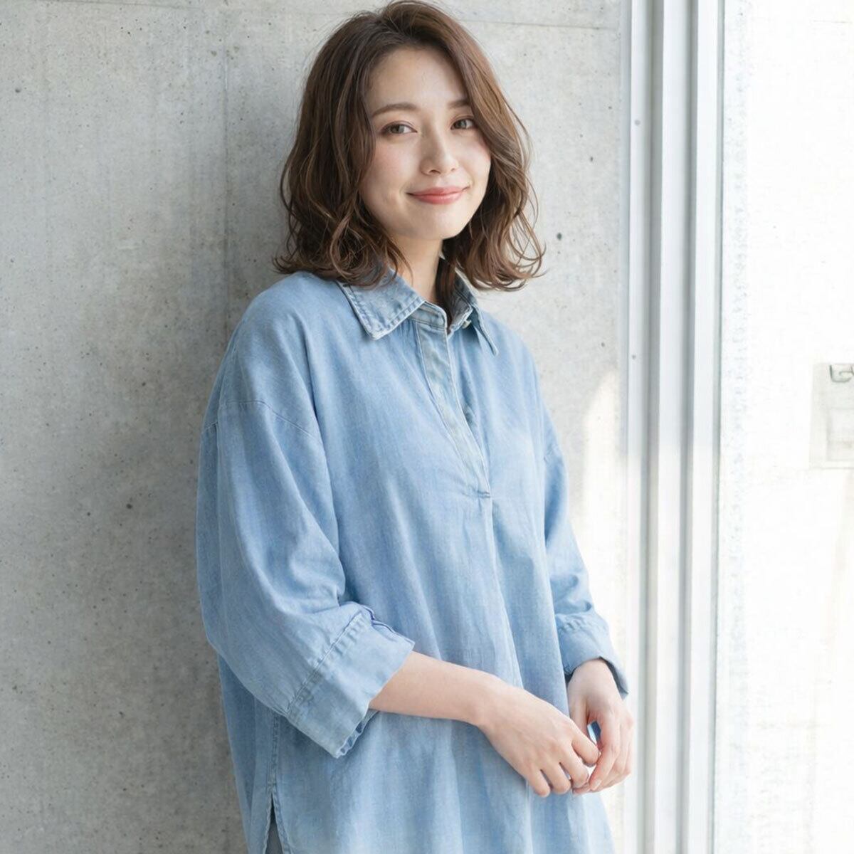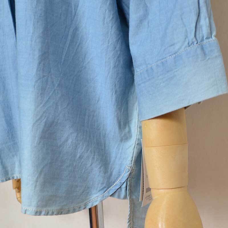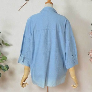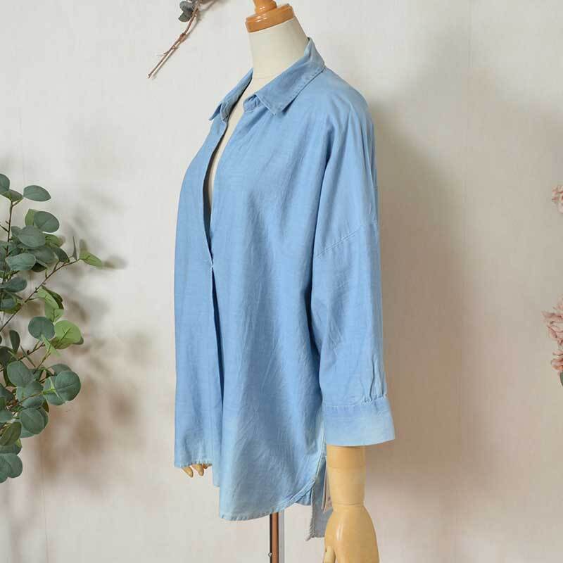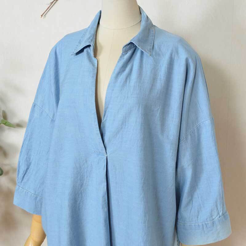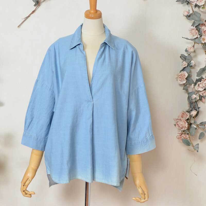 綿100% 涼感デニム スキッパーブラウス ヴィンテージ風 7分袖 LL