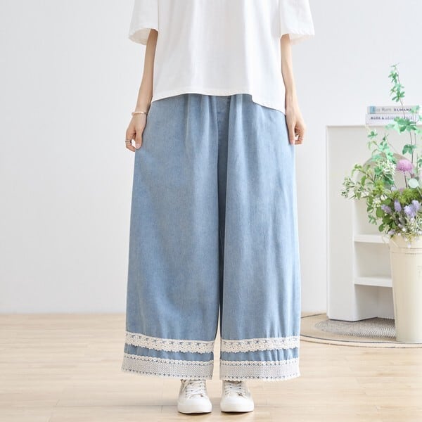 裾レース デニムライクワイドパンツ ウエストゴム 韓国っぽ